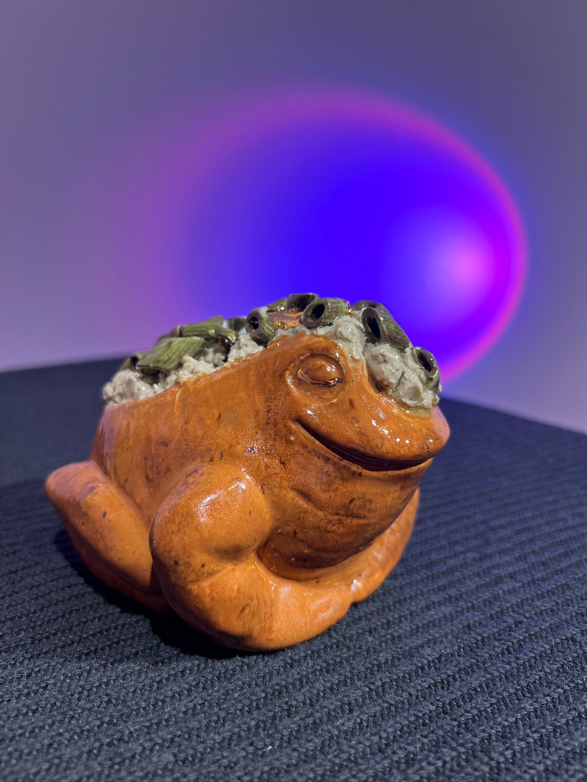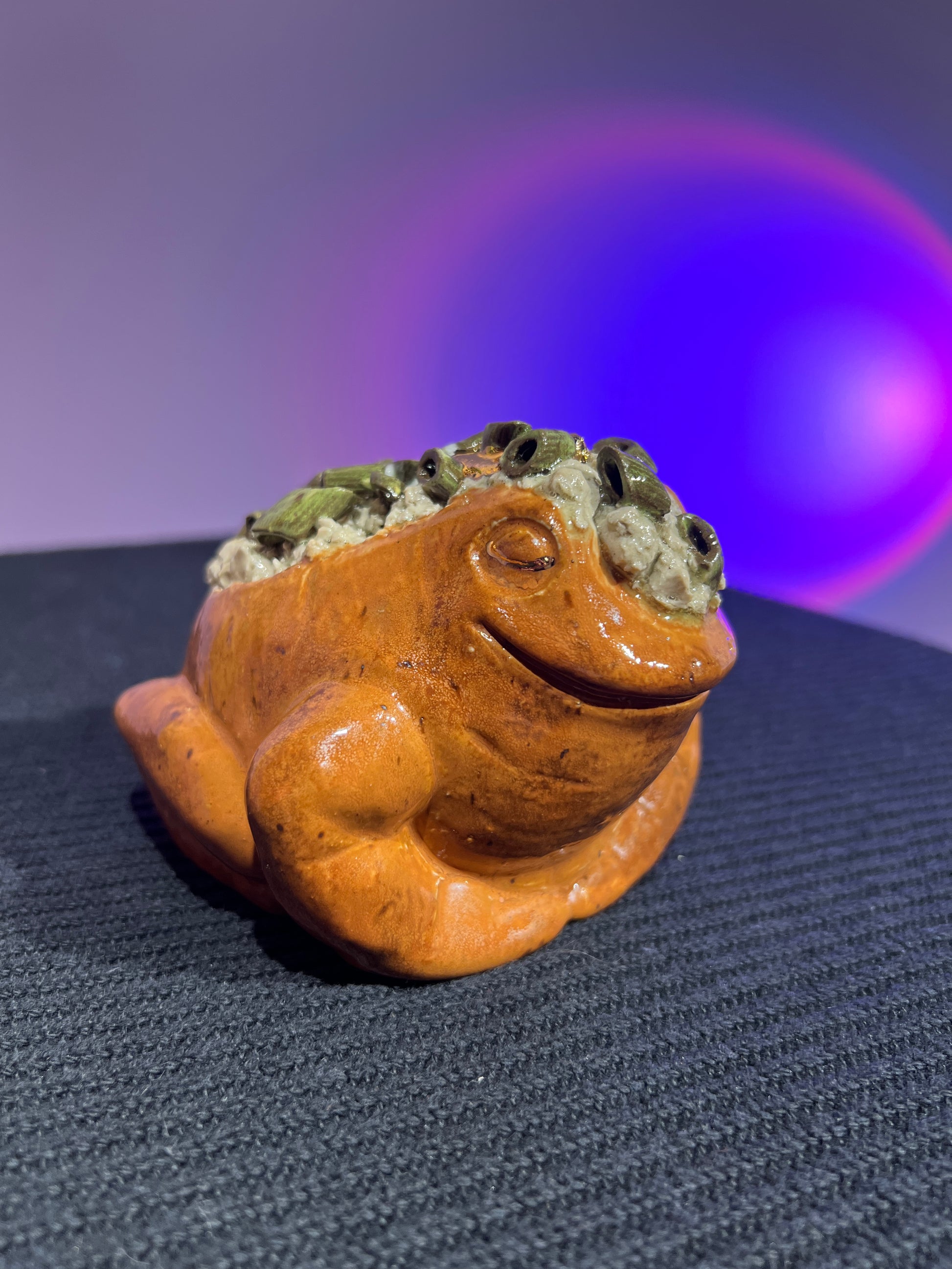 Each frog is a hollow cast from the pottery molds we created, and I always give them a little something extra during the sculpting stage. This Lil’ Frog is safe to take outdoors, but will live happiest inside. He should definitely be brought indoors for freezing temperatures to avoid potential breakage.