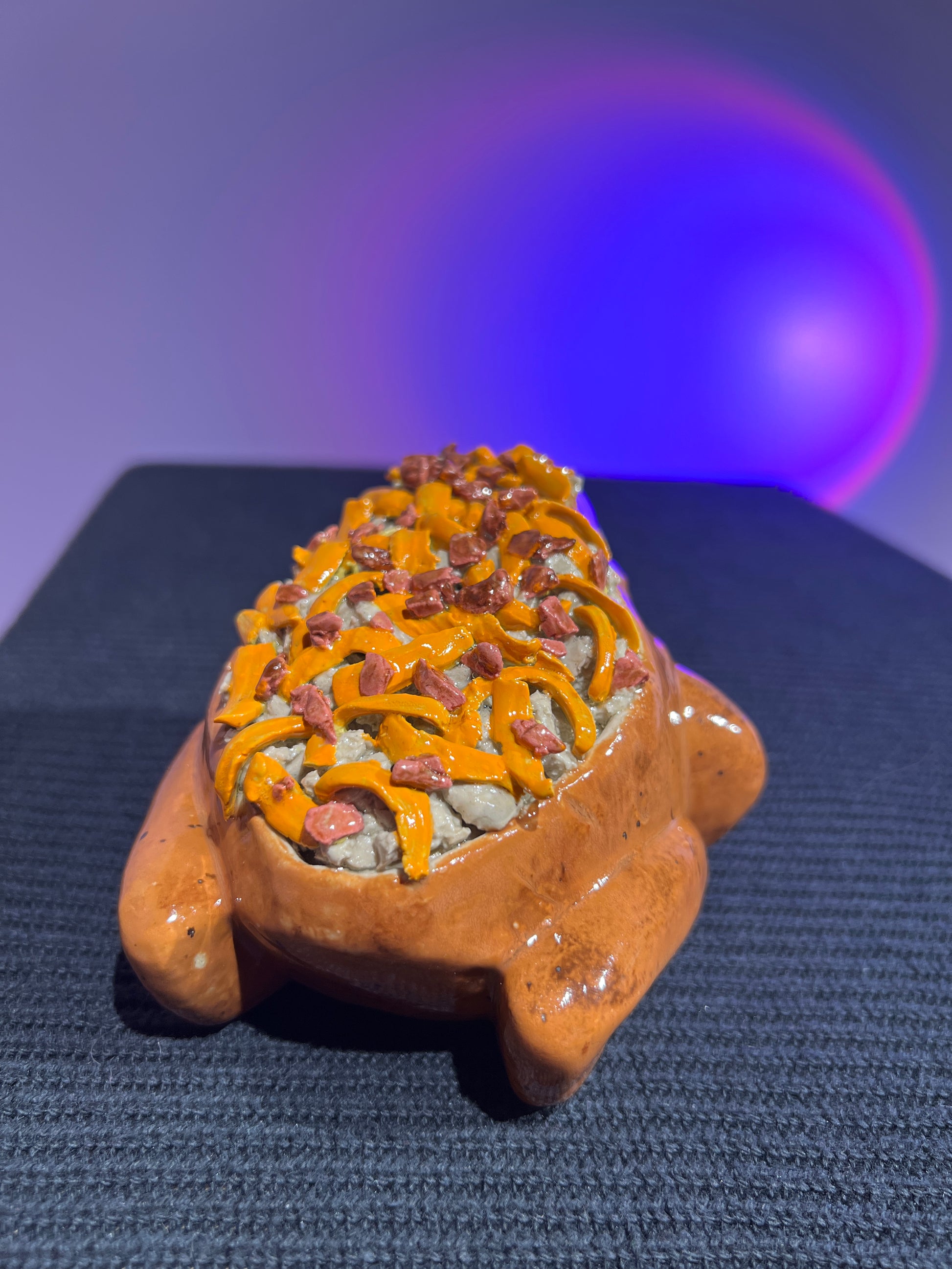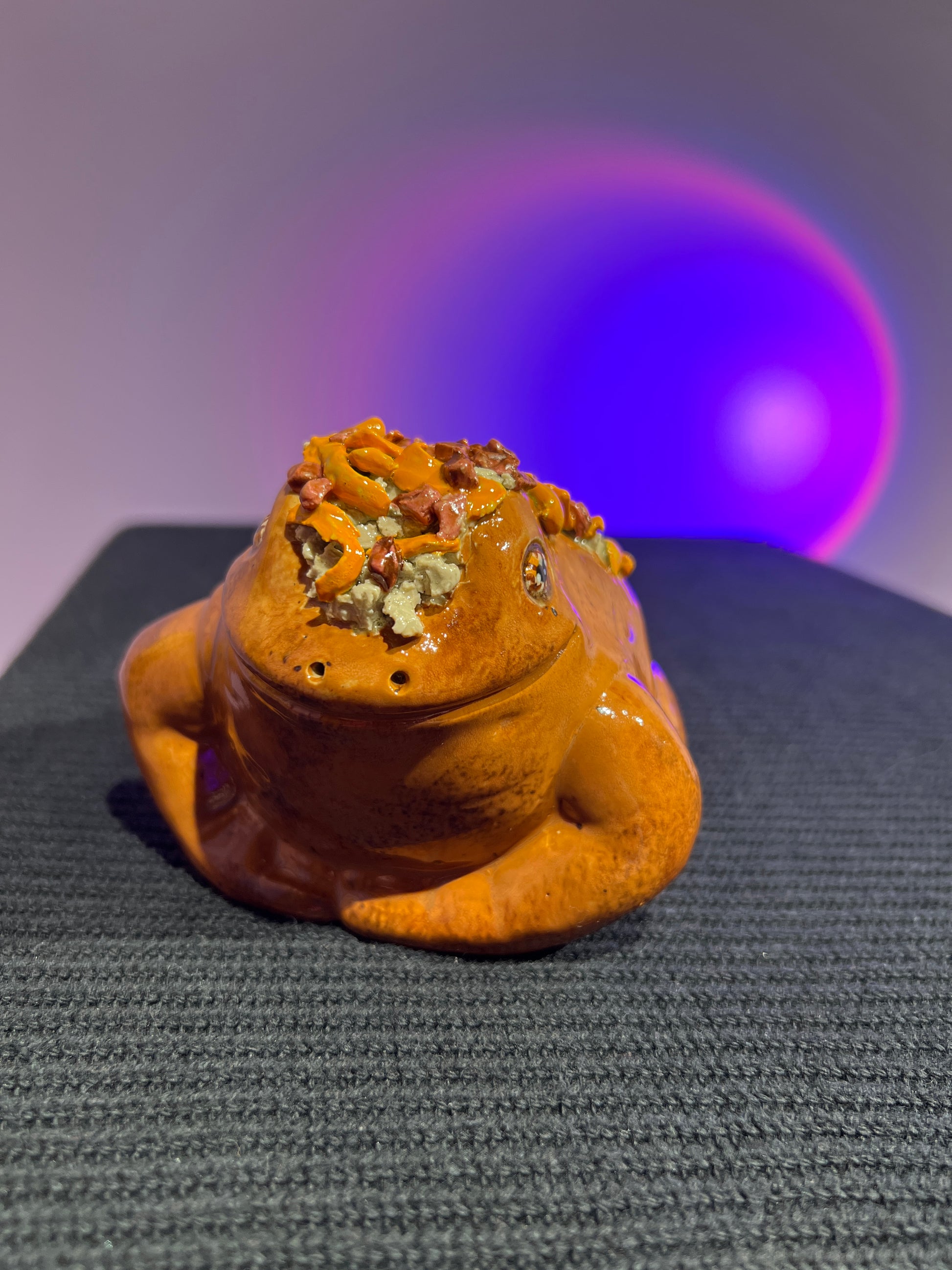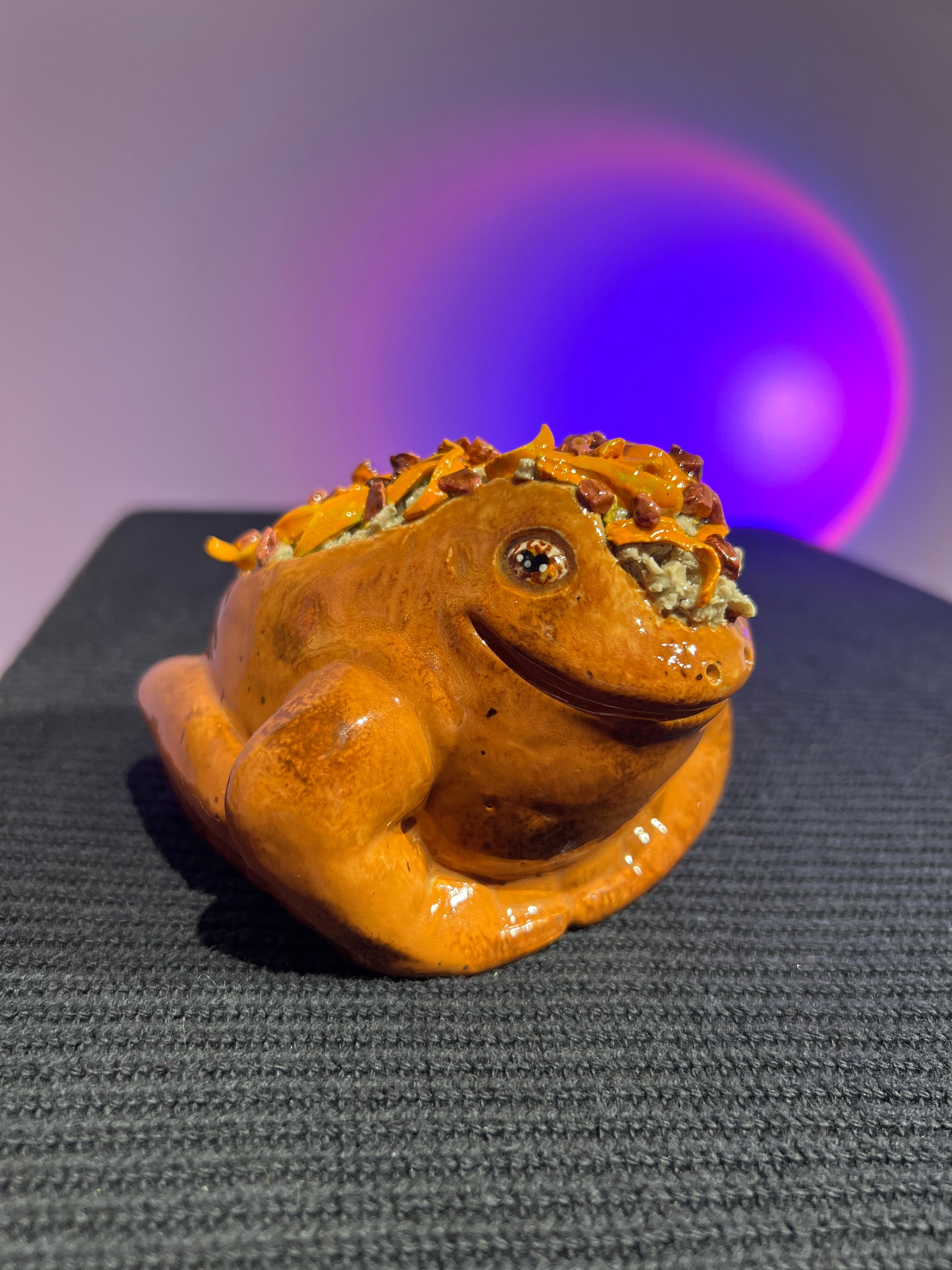Each frog is a hollow cast from the pottery molds we created, and I always give them a little something extra during the sculpting stage. This Lil’ Frog is safe to take outdoors, but will live happiest inside. He should definitely be brought indoors for freezing temperatures to avoid potential breakage.