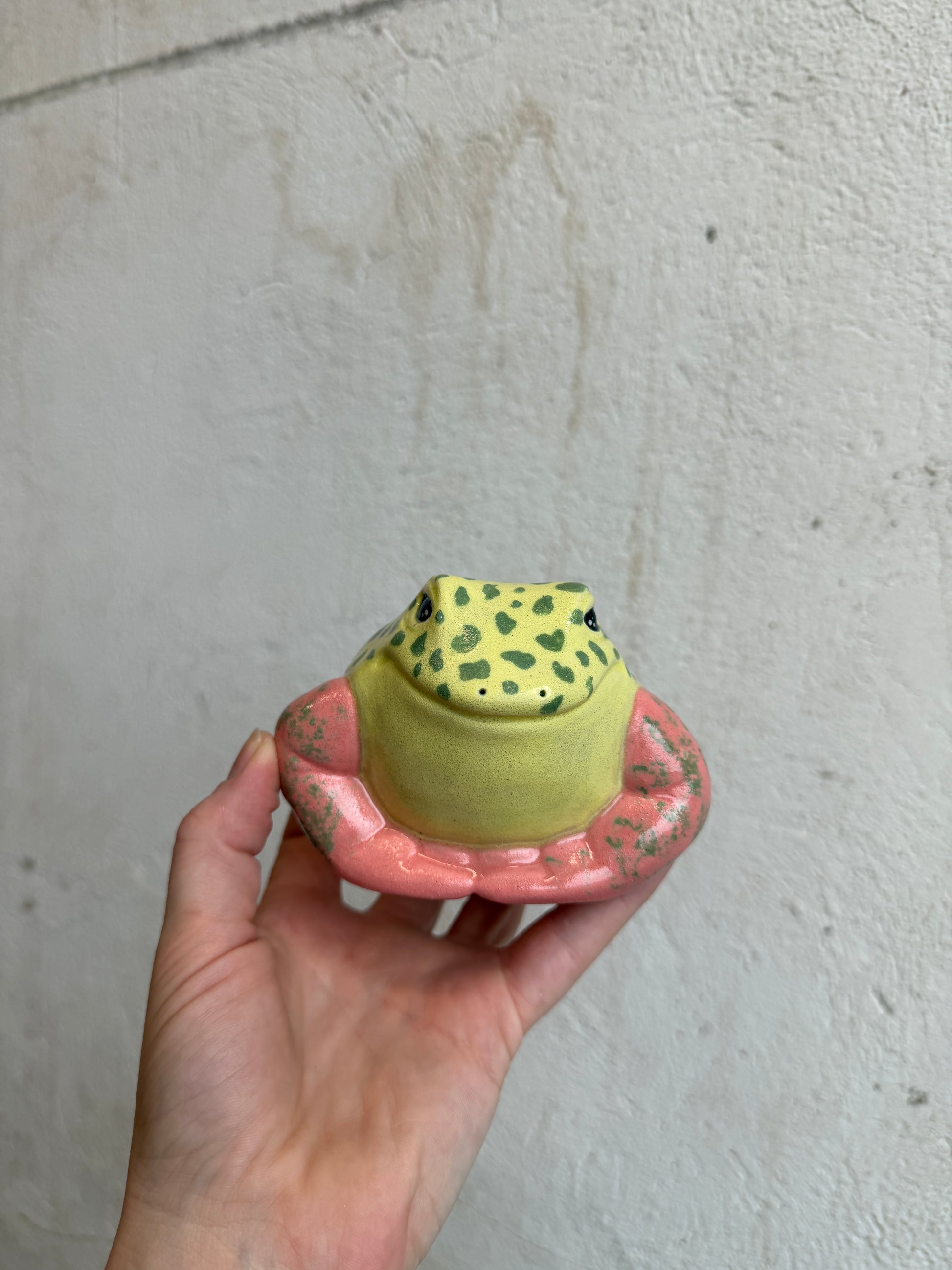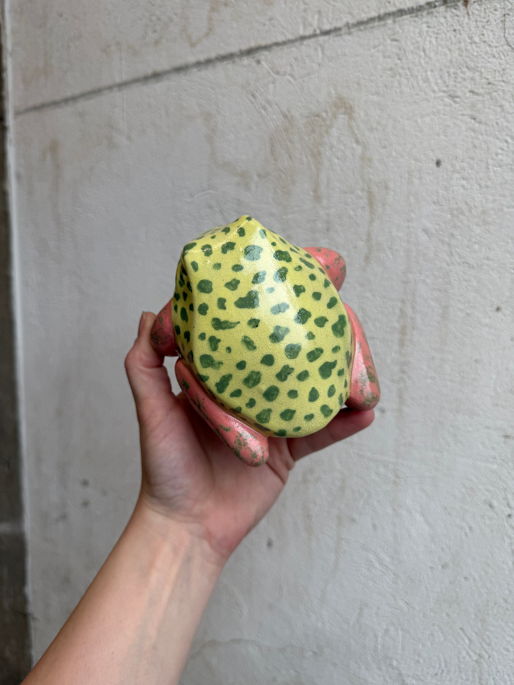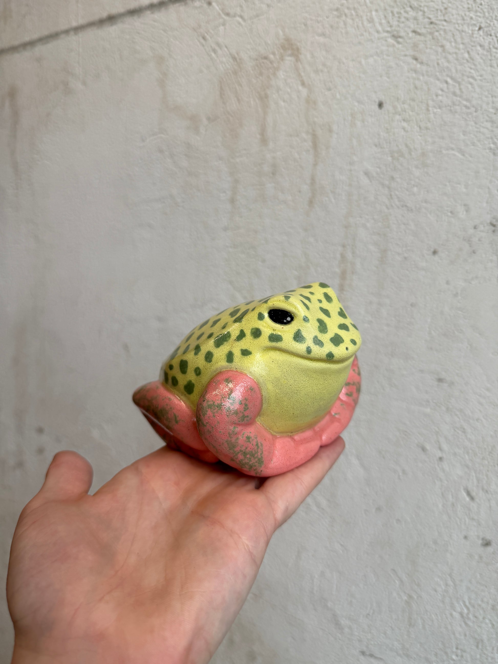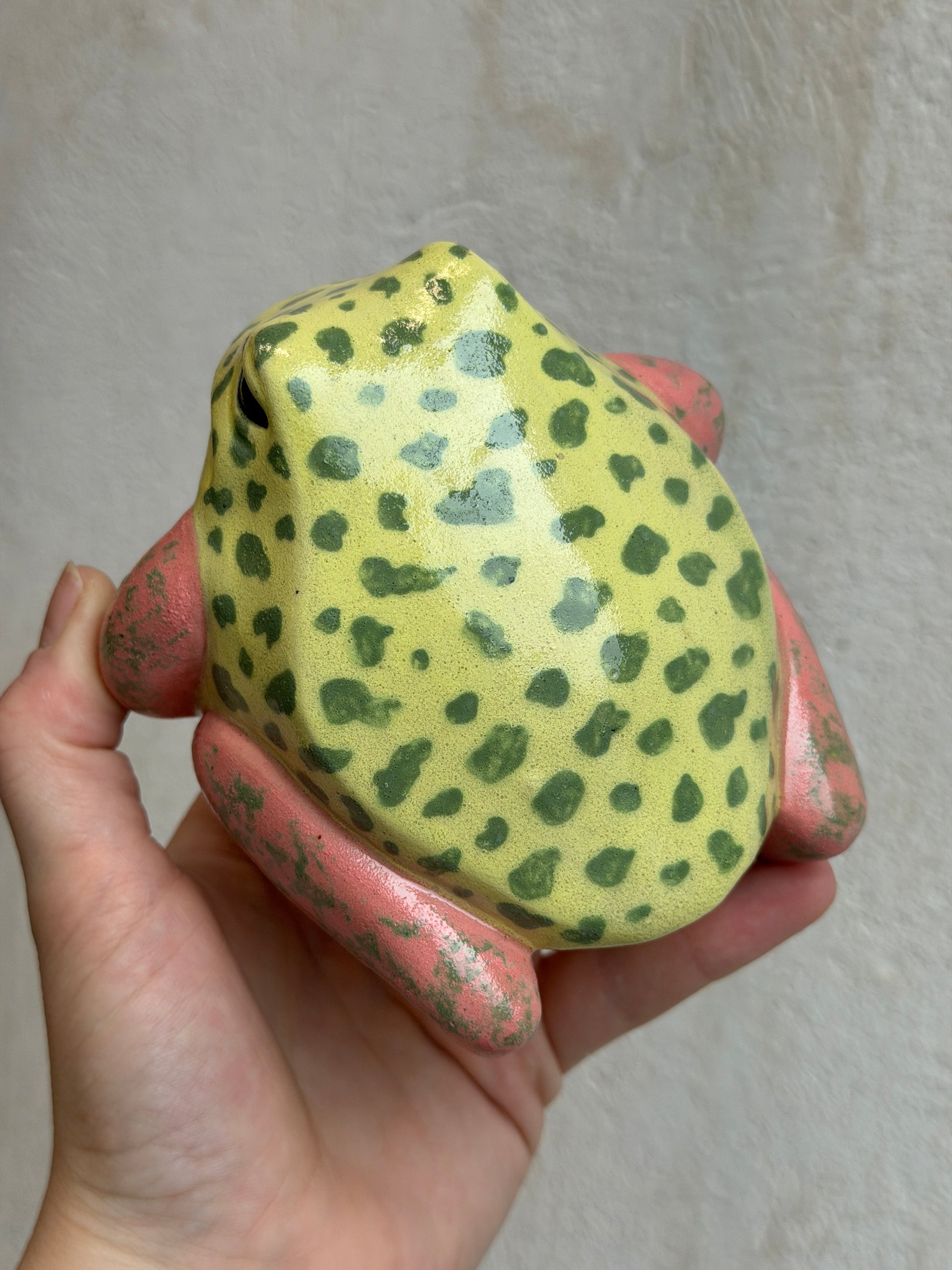 Each frog is a hollow cast from the pottery molds we created, and I always give them a little something extra during the sculpting stage. This Lil’ Frog is safe to take outdoors, but will live happiest inside. He should definitely be brought indoors for freezing temperatures to avoid potential breakage.